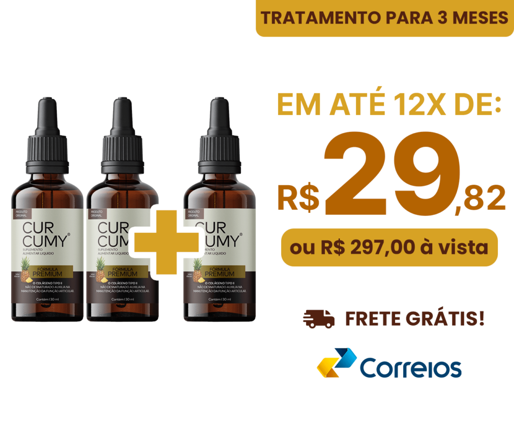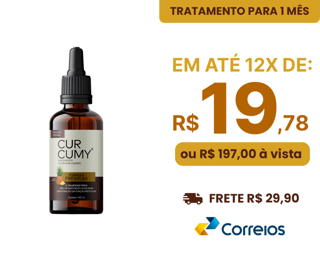 Ingerir 1 ml (12 gotas) do Curcumy por dia (sabor suave de abacaxi), pode ser colocado em alguma bebida de sua preferência, para um alívio prolongado da dor.